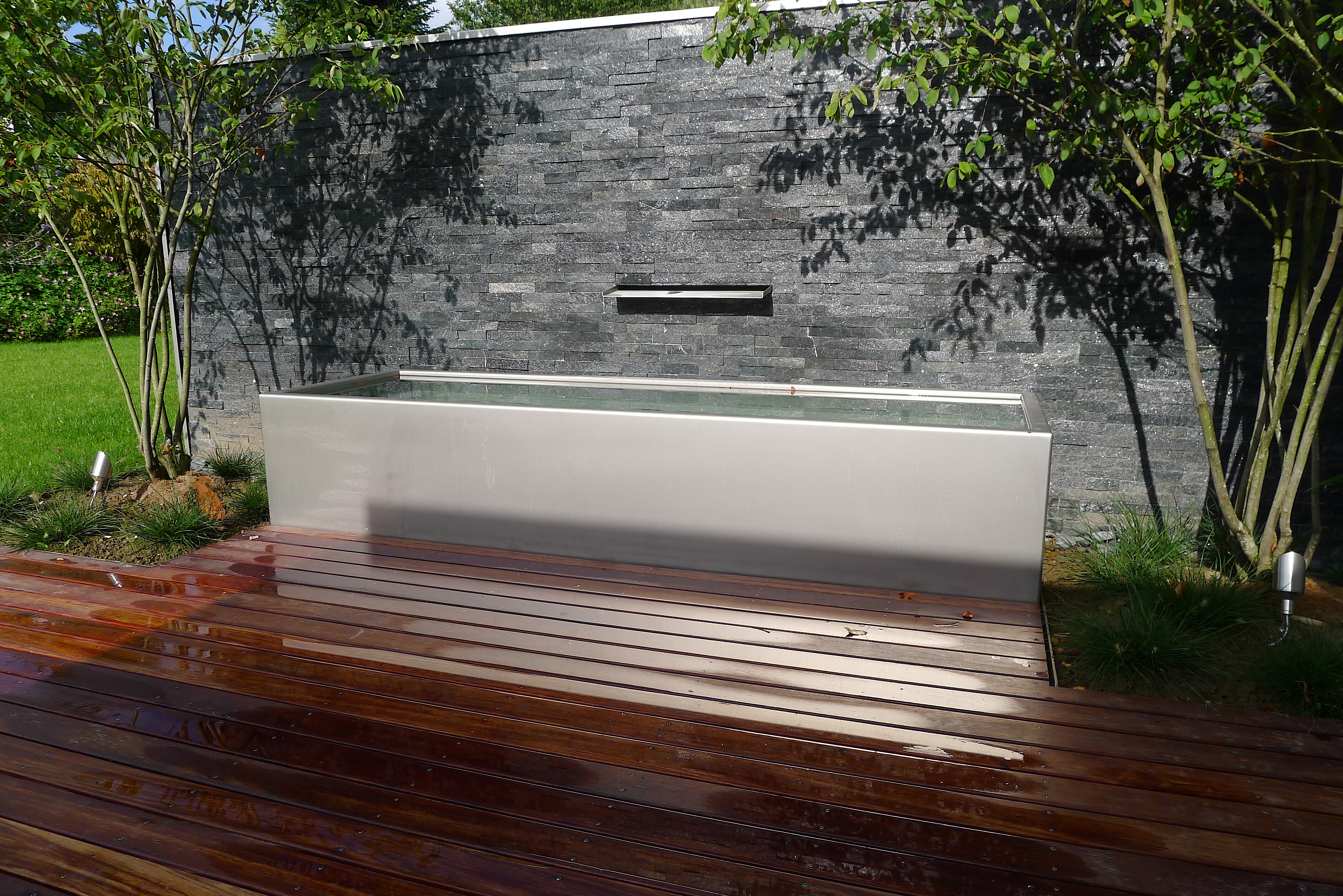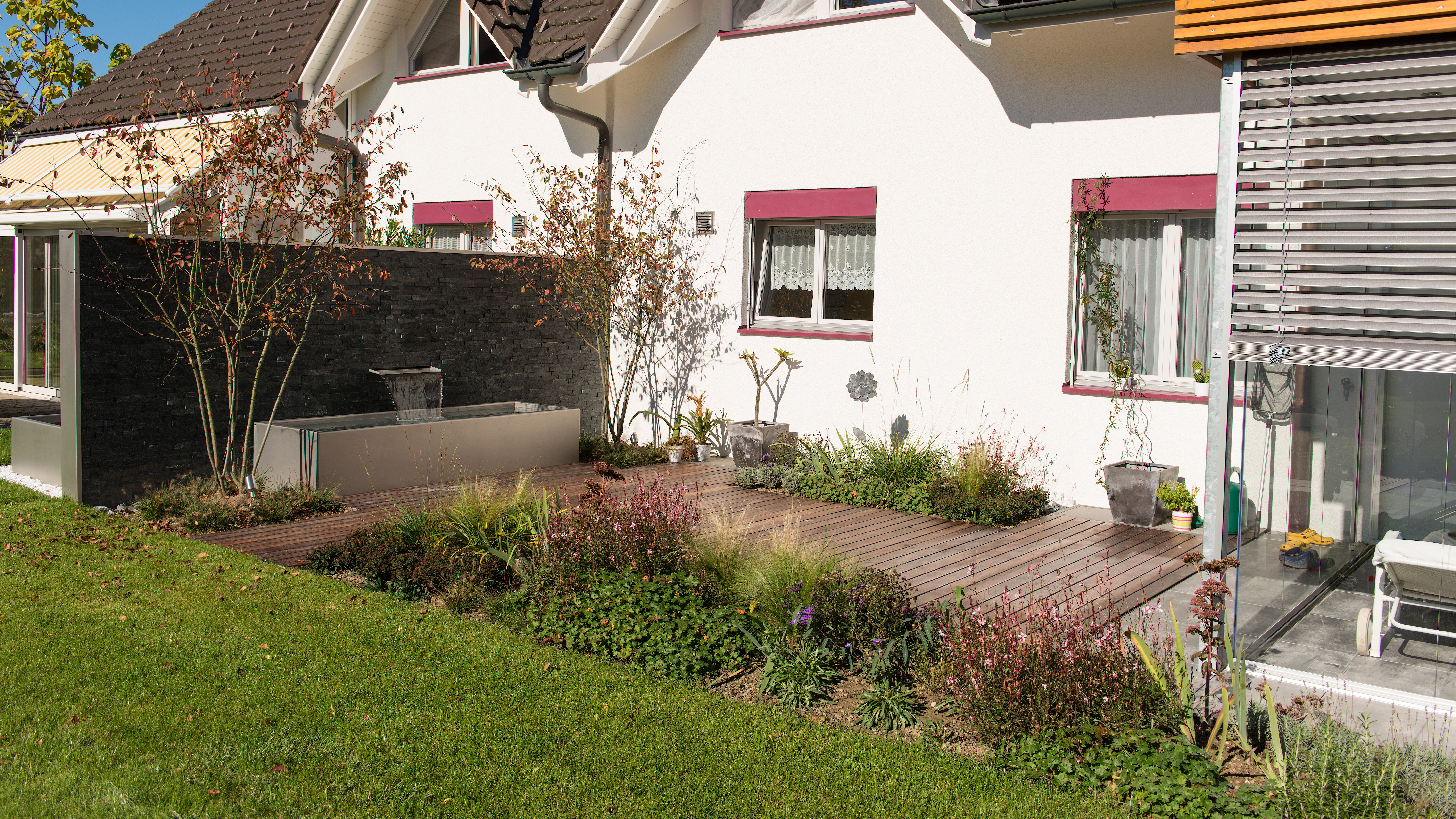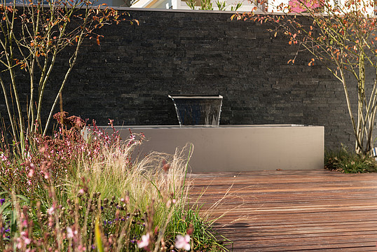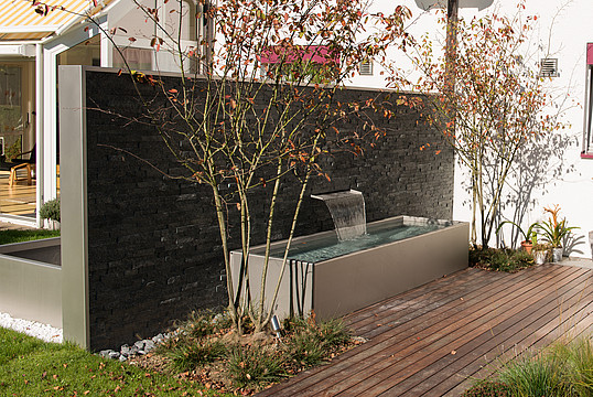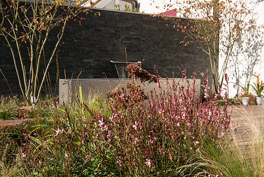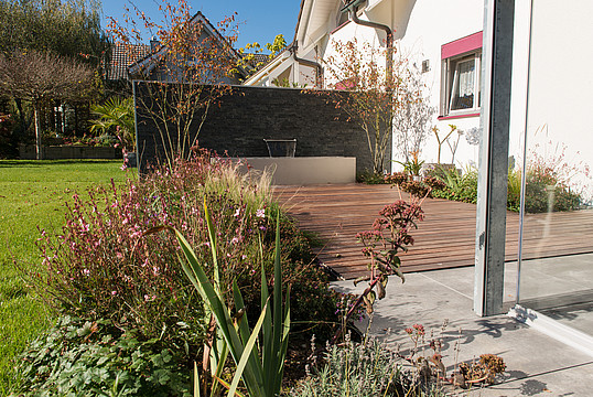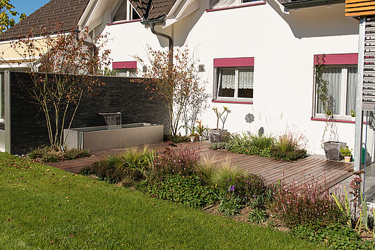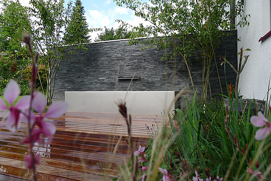 Leistungen: Rodungen, Erdarbeiten, Mauer mit Natursteinvorsatz, Sitzelemente, Brunnen, Holzterrasse, Sichtschutzelement, Bepflanzung, Rasen